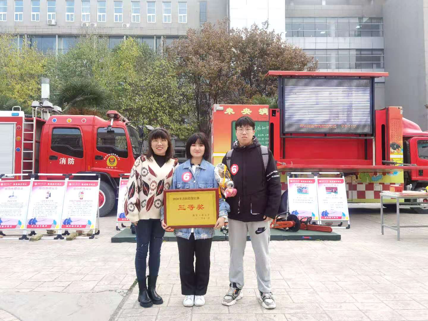 首先,学校保卫处进行了消防装备展示和消防服原地着装,精良的装备和保卫处队员们干练的身姿赢得了全场的掌声。紧接着进行了灭火及烟雾逃生比赛。比赛中我们学生行动迅速,动作干净利落。穿过烟雾逃生阶段时,马淑婷同学冷静应对,动作标准,迅速通过完成接力。杨豪同学熟练的运用电子灭火器进行灭火,在争取取得良好成绩的同时也不忘安全。最终取得了灭火及烟雾逃生决赛三等奖的优秀成绩。