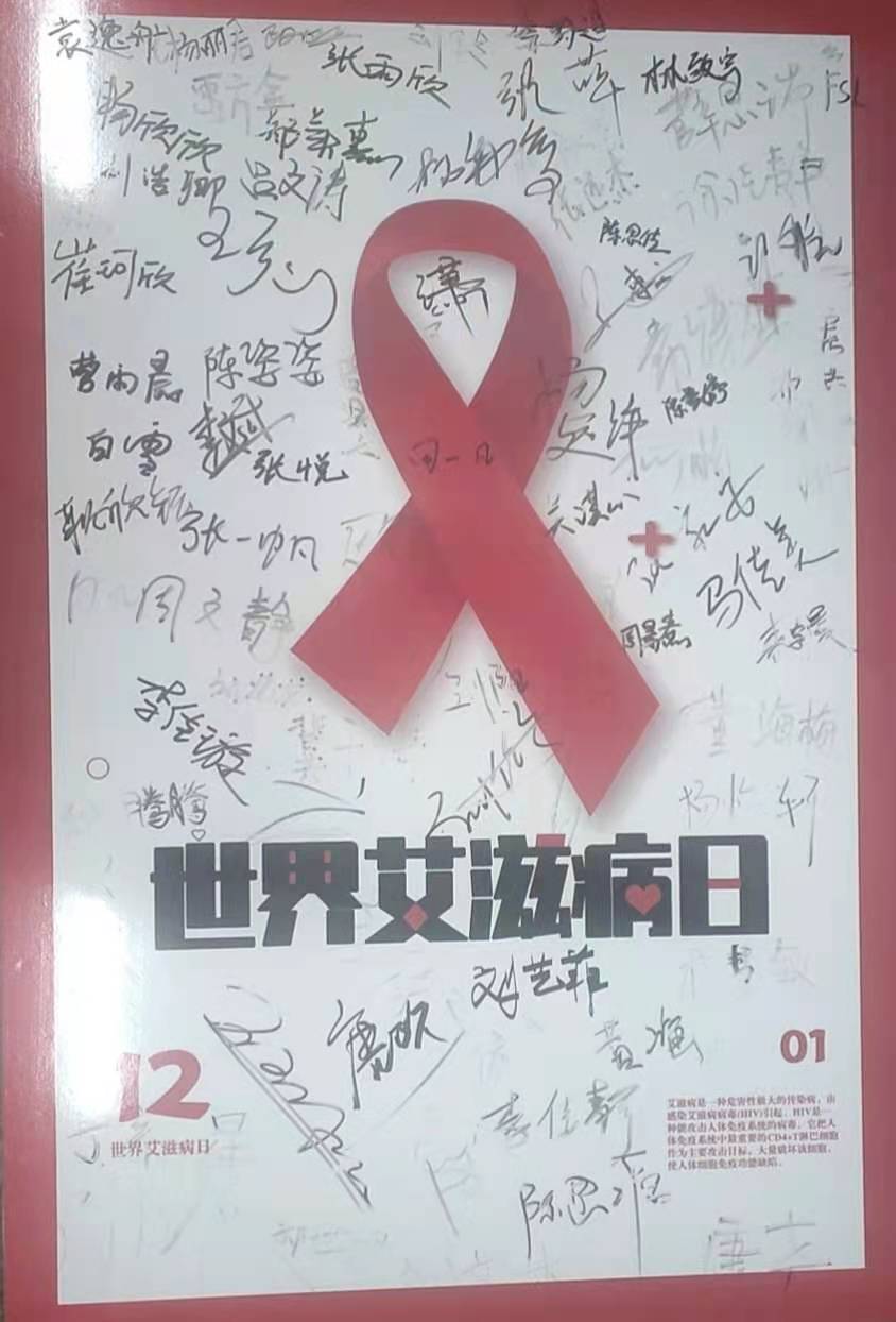 活动现场,为同学们展示以“世界艾滋病日”为主题的展板,宣传预防艾滋病有关知识。组织同学在防艾宣传展板上签字,呼吁大家携手共同遏制艾滋。通过相关宣传让学生改变对艾滋病以及传染病的片面认知,在增强自我保护、关爱理解艾滋病患者方面有了新的感悟,此次活动也起到了积极的宣传效果。