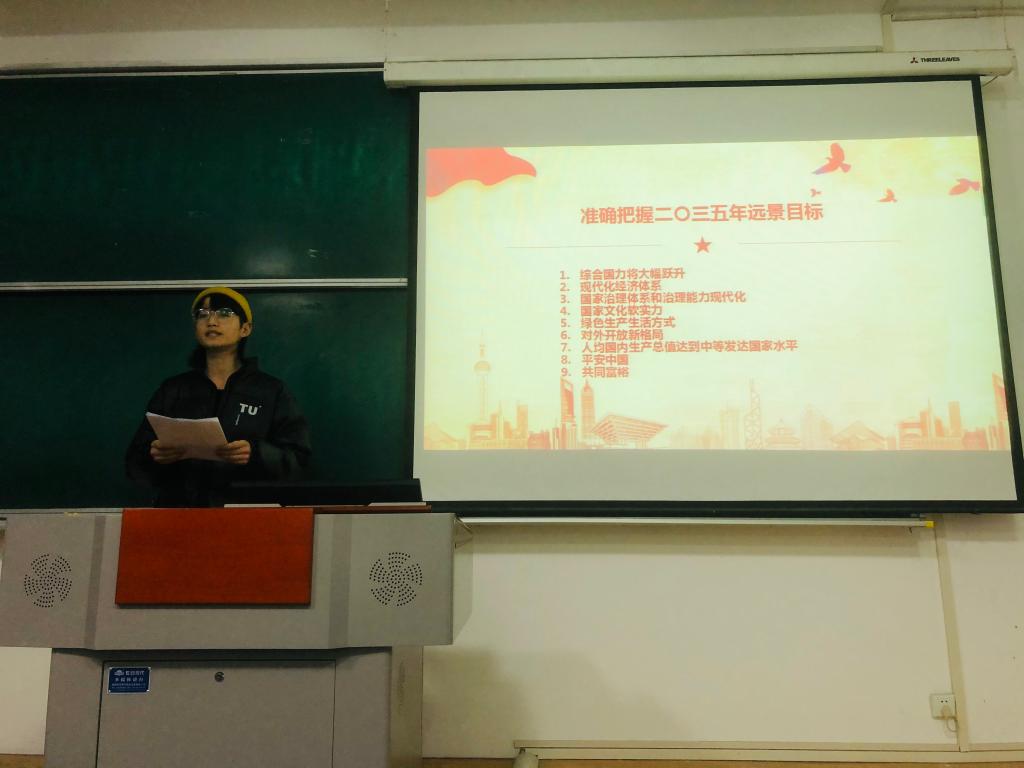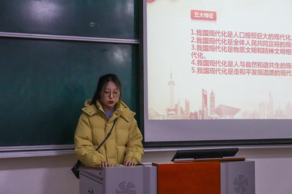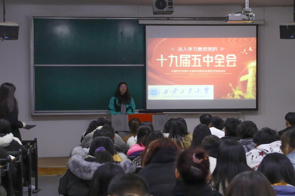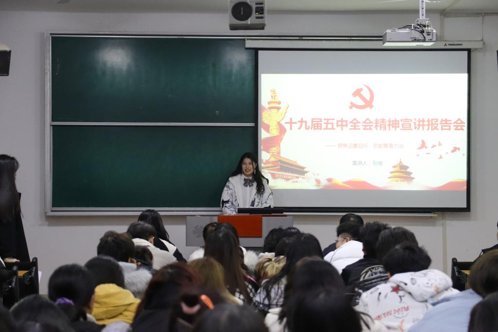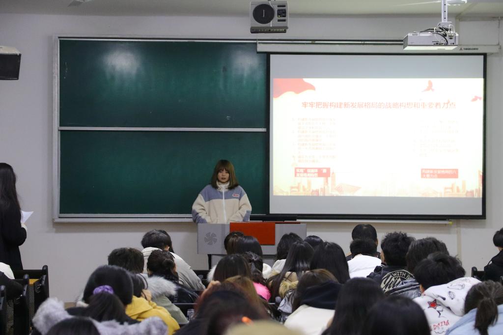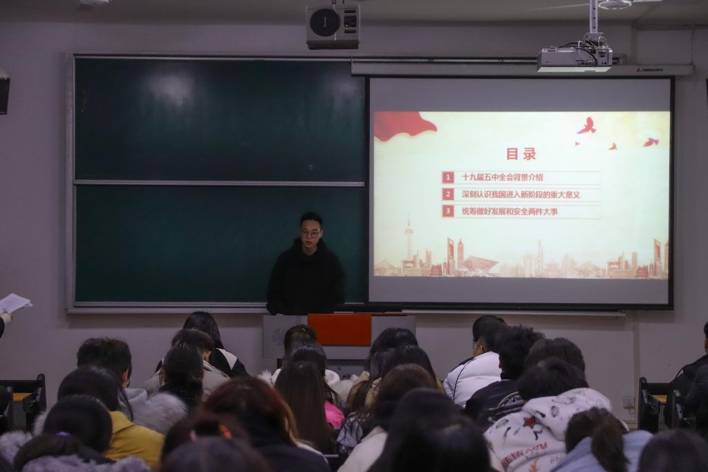 首先,张晓宾老师对党的十九届五中全会的背景、过程和意义进行了解读。接着,我们“十九届五中全会精神”学生宣讲团成员苏文静、郑定强、孟航、侯佳佳、李幸子、白文飞、孙俊和王甜甜等深入讲解了党的十九届五中全会背景、意义和主要内容,并结合会议公报中的相关内容和生活中的鲜活案例谈了自己的认识。