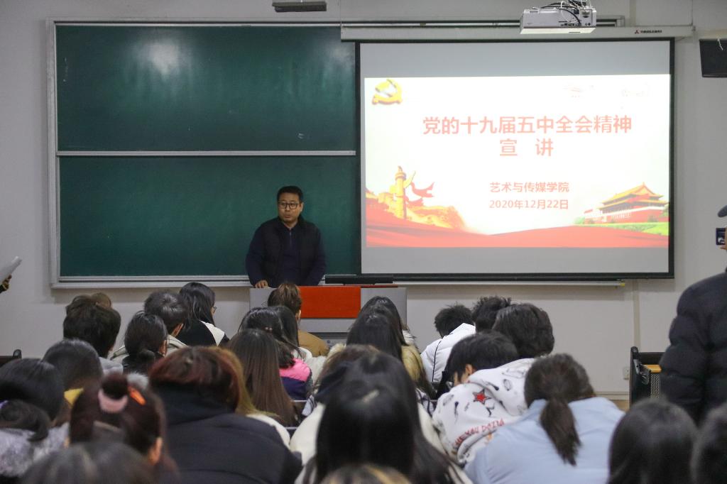 为深入贯彻党的十九届五中全会精神,把思想和行动统一到党中央的决策和部署上来,进一步增强全体学生的“四个意识”、坚定“四个自信”,做到“两个维护”。艺术与传媒学院于2020年12月22日晚19:00在教2-207举行党的十九届五中全会精神宣讲,会议由院党委委员张晓宾老师主持,全体辅导员和学生党员、学生干部150多人参加了活动。