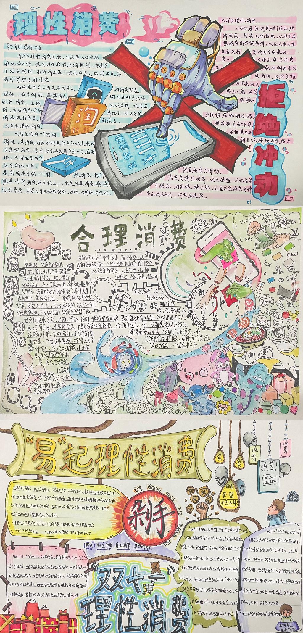 比赛共收到113份手抄报作品,同学们将自己对理性消费不同的的认识及如何树立正确的消费观等理解融入手抄报作品中,呼吁大家要杜绝攀比心理,不炫耀,不从众,减少不必要的开支,在自己所能承受的范围内适度消费;要树立正确的消费观,养成科学合理的消费习惯;购买物品前,要三思,克制过分的消费欲望,购买生活必需品。