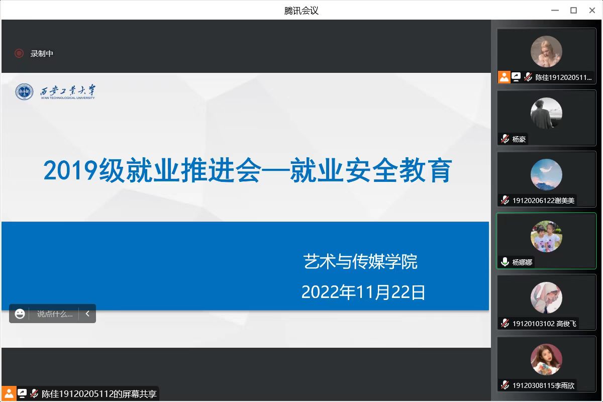 为切实提高学院毕业生的就业安全意识,教育引导毕业生树立正确就业观,构建平安和谐校园,11月22日中午12:00,2019级通过腾讯会议召开就业推进会—就业安全教育,会议由2019级辅导员杨娜娜主持,2019级毕业班全体学生参加。