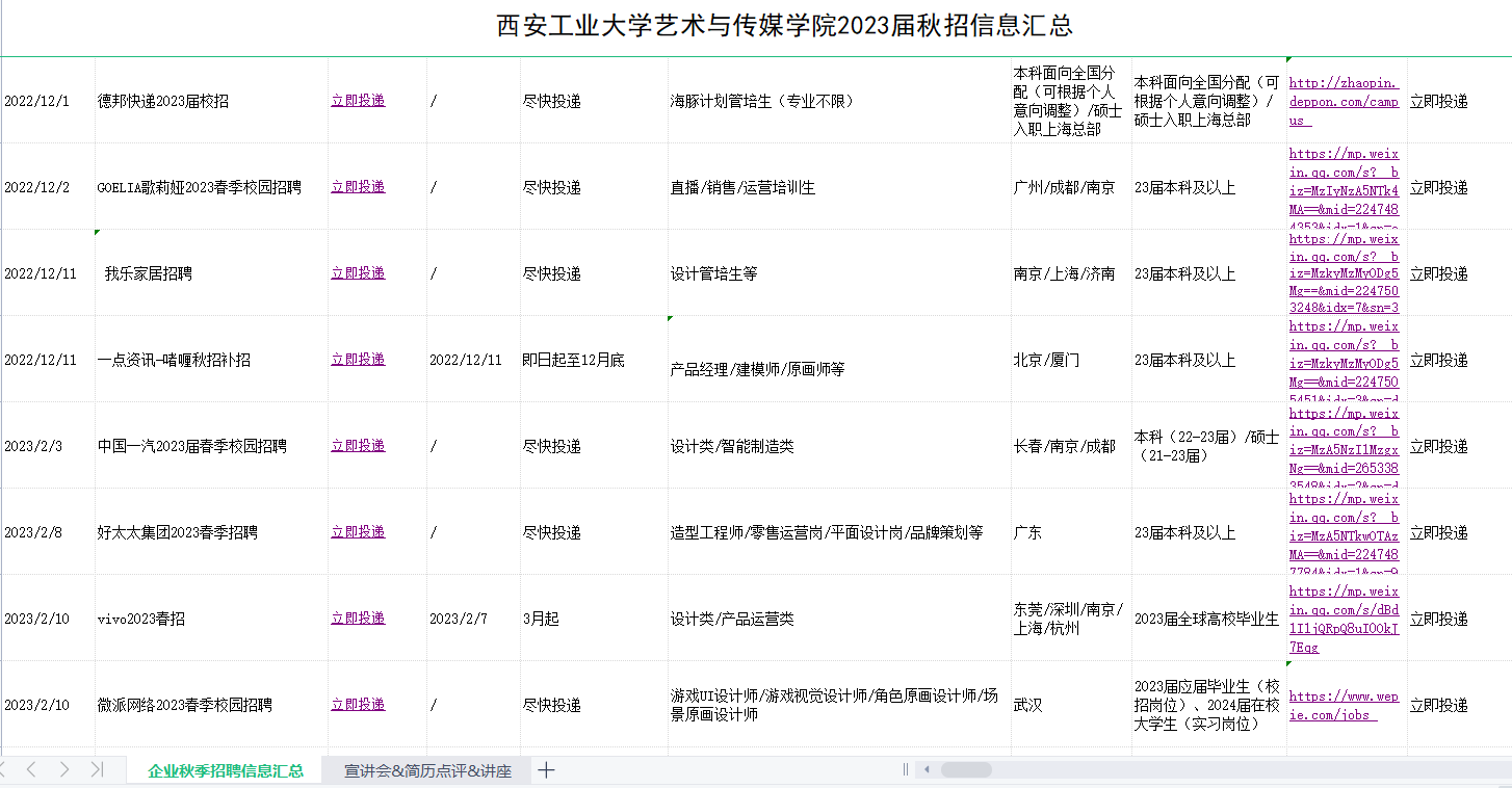 为确保2023届毕业生充分高质量就业,拓宽学生就业渠道,完善就业指导供给,强化精准就业服务,学院以学生需求为导向,切实推进毕业生就业工作。2022年9月至今,学院立足实际,广泛收集就业相关信息,整合各类招聘资源,通过QQ群、公众号等形式,持续进行就业信息精准推送,推送信息达百余条。