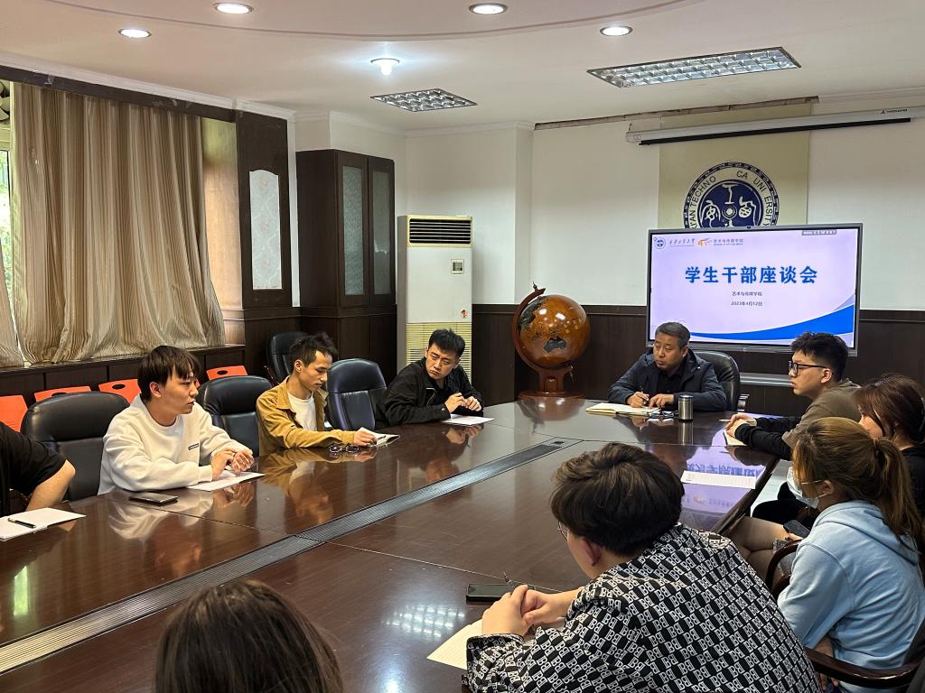 为进一步贯彻落实“以学生为本”的理念,深入了解并解决学生的实际困难,大兴调查研究之风。艺术与传媒学院于2023年4月12日下午在金花校区接待室召开“倾听诉求,暖心交流”学生干部座谈会。会议由艺术与传媒学院党委副书记张晓宾主持,辅导员组长孙雅茹及各年级学生干部代表参加本次座谈会。
