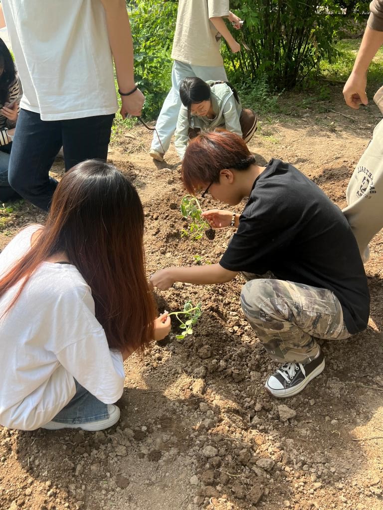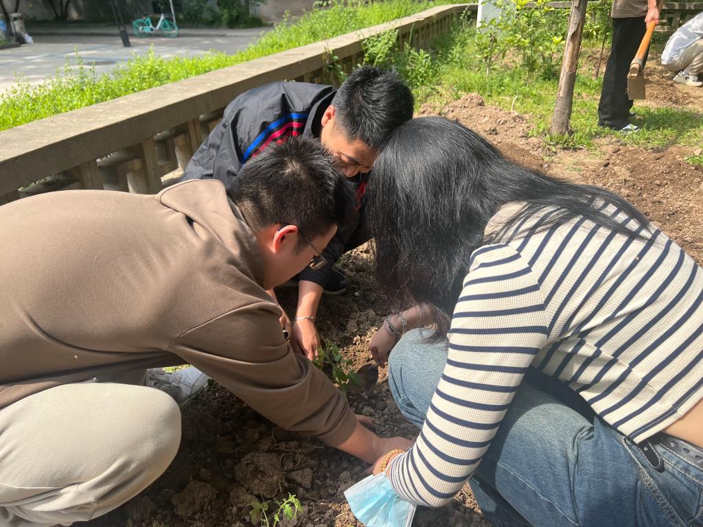活动前,大家携带了锄头、铁锨、耙锄、小铲子、西红柿苗、黄瓜苗、塑料盆、塑料桶等,在洪涛老师的组织下分为除草、松土、栽苗、浇水四组。活动中,四组成员分工明确、相互协作、历时1个多小时完成了西红柿、黄瓜的栽植,老师和同学们在烈日下挥汗如雨,手指上也沾满泥土,但是这些丝毫不影响大家的劳动热情。