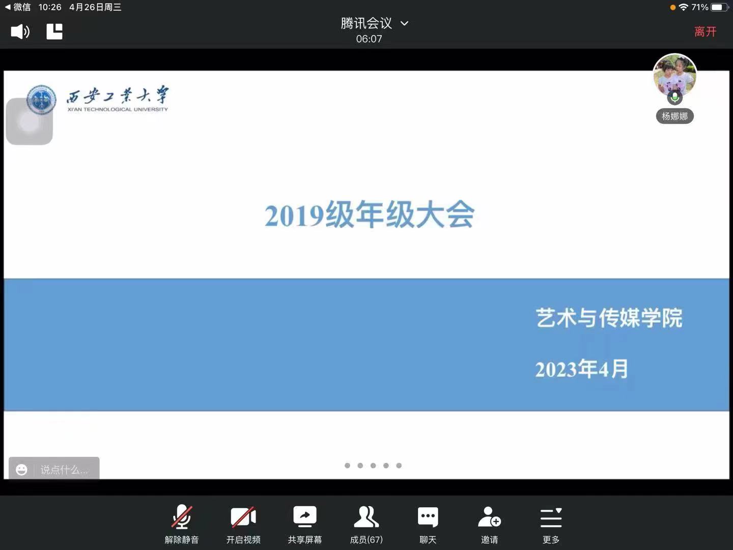 为切实做好2023届毕业生教育工作,帮助毕业生更好的熟悉毕业流程,确保毕业生安全就业,4月26日下午,艺术与传媒学院2019级通过腾讯会议召开年级大会。会议由2019级辅导员杨娜娜主持,2019级毕业班全体学生参加。