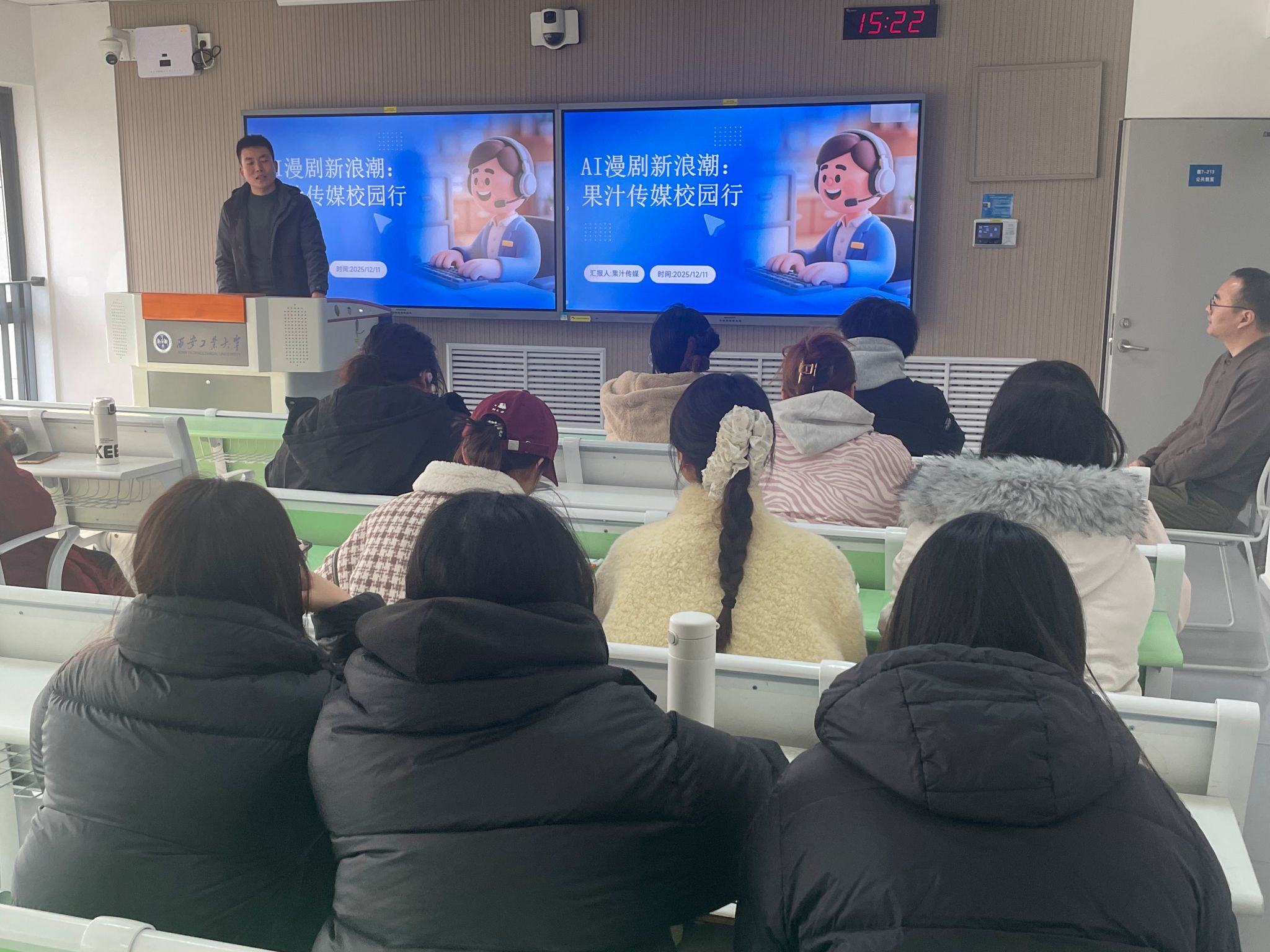 宣讲环节,冯柯从企业发展历程、业务板块、团队建设理念等方面展开介绍,重点解读了本次针对数媒专业毕业生开放的实习及就业岗位详情,涵盖数字内容创作、影视后期制作等多个岗位。在互动咨询环节,毕业生们围绕岗位薪酬福利、实习考核标准、职业晋升路径等问题积极提问,冯柯及招聘团队成员逐一细致解答,并针对现场部分毕业生展示的个人作品集给出专业点评。