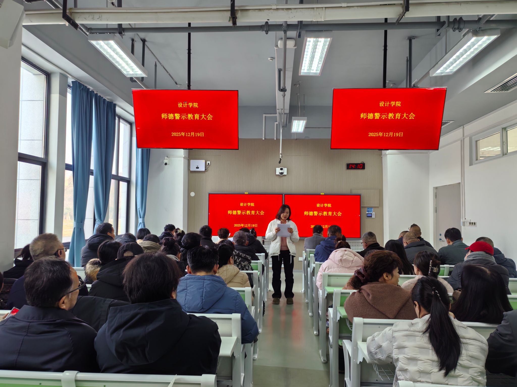 会上,院党委纪委委员祝瑜通报了北京建筑大学教师许某等4位教师违反《新时代高校教师职业行为十项准则》典型案例,让全体教师直观感受师德失范行为的严重后果与恶劣影响。随后,大会重点组织全体教师深入学习了《师德警示教育案例汇编》《师德规范学习手册》等内容,进一步强化了教职员工“以案为鉴、警钟长鸣”的防范意识,筑牢了廉洁从教、廉洁治学的思想防线,切实推动警示教育从“被动学习”向“主动警醒”转变。